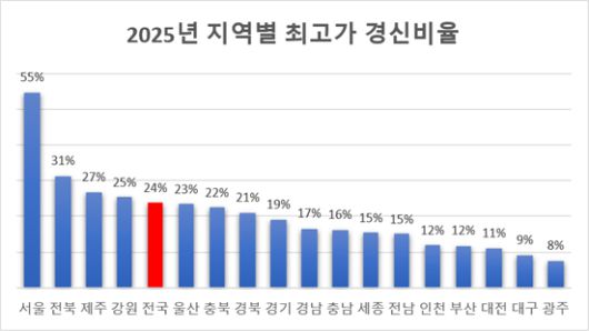 2025년 지역별 아파트 최고가 경신 비율. |