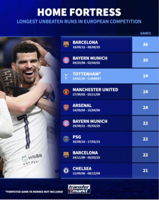 토트넘은 다가오는 경기에서 프랑크푸르트와 경기를 위해 원정을 떠나는데, 이후 토너먼트에 진출한 후 홈에서 지지 않는다면 이 기록을 계속 이어갈 수 있다. 이번 시즌에 챔피언스리그 우승까지 성공한다면 더욱 빠르게 2위 기록을 넘볼 수 있지만, 매체는 그럴 가능성은 매우 낮다고 점쳤다.