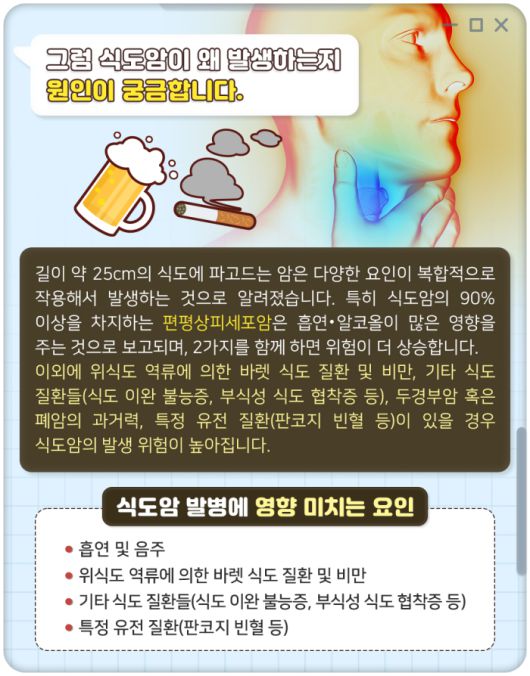 길이 약 25cm의 식도에 파고드는 암은 다양한 요인이 복합적으로 작용해서 발생하는 것으로 알려졌습니다. 특히 식도암의 90% 이상을 차지하는 편평상피세포암은 흡연‧알코올이 많은 영향을 주는 것으로 보고되며, 2가지를 함께 하면 위험이 더 상승합니다.