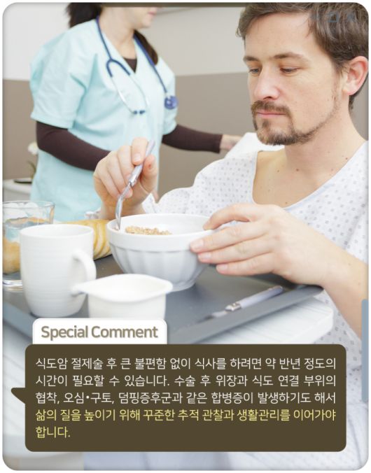 식도암 절제술 후 큰 불편함 없이 식사를 하려면 약 반년 정도의 시간이 필요할 수 있습니다. 수술 후 위장과 식도 연결 부위의 협착, 오심‧구토, 덤핑증후군과 같은 합병증이 발생하기도 해서 삶의 질을 높이기 위해 꾸준한 추적 관찰과 생활관리를 이어가야 합니다.