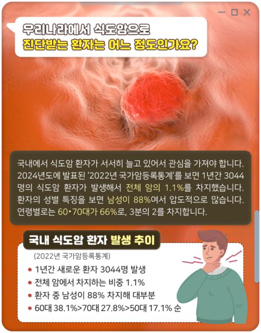 국내에서 식도암 환자가 서서히 늘고 있어서 관심을 가져야 합니다. 2024년도에 발표된 '2022년 국가암등록통계’를 보면 1년간 3044명의 식도암 환자가 발생해서 전체 암의 1.1%를 차지했습니다. 환자의 성별 특징을 보면 남성이 88%여서 압도적으로 많습니다. 연령별로는 60‧70대가 66%로, 3분의 2를 차지합니다.