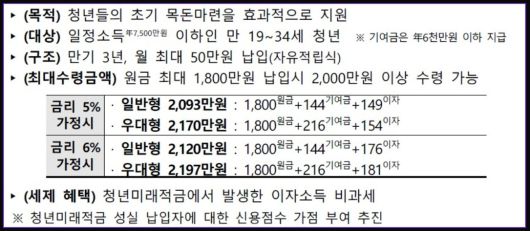청년미래적금은 기존 '청년도약계좌'에 비해 만기를 단축(5→3년)하고, 정부기여금을 대폭 확대한 것이 특징이다. 청년들이 2000만원 이상의 목돈을 효과적으로 마련할 수 있도록 지원한다.