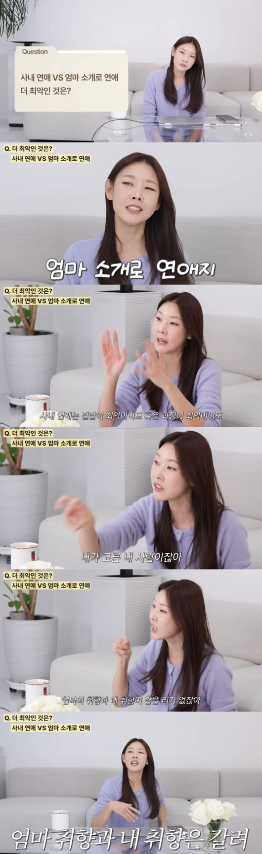 그는 "더 최악인 건 엄마 소개 연애"라며 "사내 연애는 결말이 최악이어도 혹은 과정이 최악이어도 내가 고른 내 사람이다. 근데 엄마의 취향과 내 취향이 같을 리가 없다. 엄마 취향과 내 취향은 갈린다"고 솔직한 생각을 밝혔다.