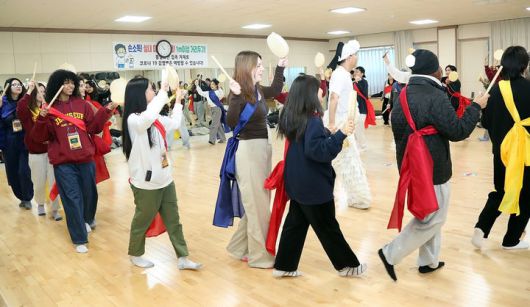 [정읍=뉴시스] 정읍시의 '글로벌 청년 겨울캠프'에 참여한 외국인 유학생과 국내 서포터즈들이 우도농악 소고춤을 체험하고 있다. *재판매 및 DB 금지 |