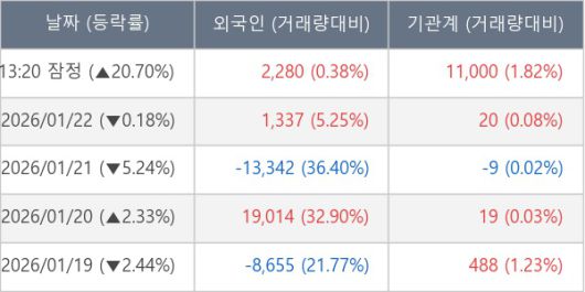 [서울=뉴스핌] 로보뉴스 = 23일 13시 30분 현재 쿠콘(294570)은 외국인과 기관이 각각 0.23 만 주, 1.10 만 주 순매수(잠정) 하면서 전일 대비 20.70% (현재가 32,650원) 상승하고 있다.