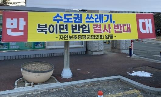 자연보호증평군협의회가 내건 수도권 쓰레기 반입 반대 펼침막. 증평군 제공 |