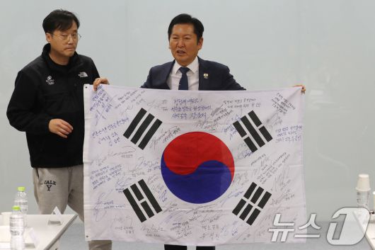 (진천=뉴스1) 김용빈 기자 = 정청래 더불어민주당 대표가 23일 충북 진천국가대표선수촌에서 국가대표지도자 간담회에서 지도자들의 사인이 담긴 태극기를 선물받고 있다.2026.1.23/뉴스1vin06@news1.krCopyright ⓒ 뉴스1. All rights reserved. 무단 전재 및 재배포, AI학습 이용 금지.