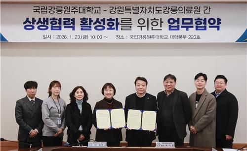 (강릉=연합뉴스) 유형재 기자 = 국립강릉원주대학교와 강원특별자치도강릉의료원는 23일 강릉캠퍼스 대학본부에서 지역 상생협력 활성화를 위한 업무협약(MOU)을 했다.