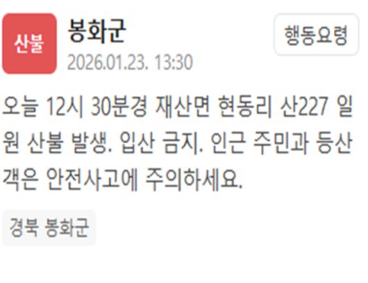 봉화군은 23일 "오늘 낮 12시 30분께 재산면 현동리 산227 일원에서 산불이 발생했다"는 내용의 재난문자를 발생했다.