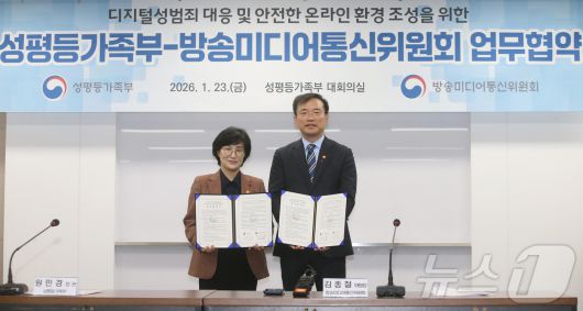 (서울=뉴스1) = 김종철 방송미디어통신위원회 위원장(오른쪽)과 원민경 성평등가족부 장관(왼쪽)이 23일 정부서울청사에서 진행된 '디지털성범죄 대응 및 안전한 온라인 환경 조성을 위한 업무협약식’에서 협약 체결후 기념 촬영을 하고 있다. (방송미디어통신위원회 제공. 재판매 및 DB 금지) 2026.1.23/뉴스1