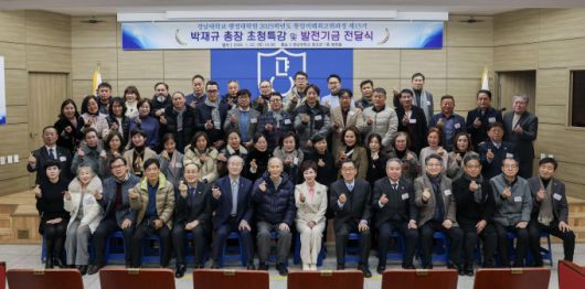박재규 경남대학교 총장(첫번째 왼쪽 일곱 번째)이 22일 오후 7시 창조관 평화홀에서 행정대학원 통일미래최고위과정 제15기 원우들을 대상으로 특강을 한 뒤 기념사진을 찍고 있다.[사진=경남대학교] 2026.01.23 |