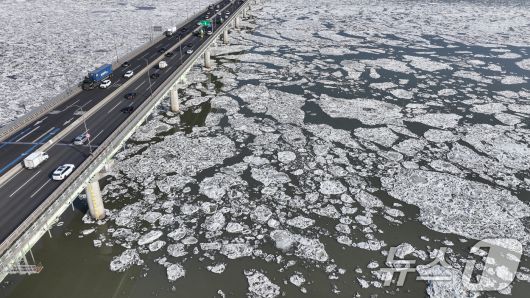 (김포=뉴스1) 김도우 기자 = 연일 한파가 이어지고 있는 23일 경기 김포시 일산대교 일대 한강 위에 유빙이 떠다니고 있다. 2026.1.23/뉴스1