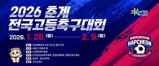 [합천=뉴시스] 서희원 기자 = 대한민국 미래 축구스타들의 각축장이 될 '2026 춘계 전국고등학교축구대회'가 오는 26일부터 내달 9일까지 15일간 군민체육공원 인조구장 및 용주구장에서 대장정을 시작한다.