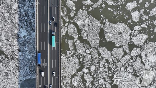 (김포=뉴스1) 김도우 기자 = 연일 한파가 이어지고 있는 23일 경기 김포시 일산대교 일대 한강 위에 유빙이 떠다니고 있다. 2026.1.23/뉴스1