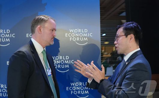(서울=뉴스1) = 여한구 산업통상부 통상교섭본부장이 22일(현지시간) 스위스 다보스에서 열린 '2026 세계경제포럼 연차회의'에서 제이미슨 그리어 미국 무역대표부(USTR) 대표와 면담을 하고 있다. (산업통상부 제공. 재판매 및 DB 금지) 2026.1.23/뉴스1