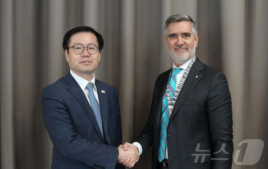 (서울=뉴스1) = 여한구 산업통상부 통상교섭본부장이 22일(현지시간) 스위스 다보스에서 열린 'WTO 비공식 통상장관 회의'에서 페르난도 브룬 아르헨티나 외교부 차관과 면담 후 기념촬영을 하고 있다. (산업통상부 제공. 재판매 및 DB 금지) 2026.1.23/뉴스1