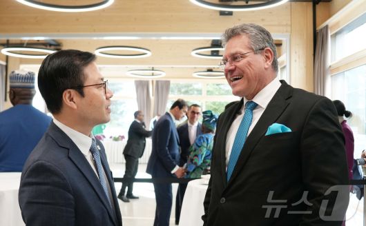 (서울=뉴스1) = 여한구 산업통상부 통상교섭본부장이 22일(현지시간) 스위스 다보스에서 열린 'WTO 비공식 통상장관 회의'에서 마로시 셰프초비치 EU 통상집행위원과 면담을 하고 있다. (산업통상부 제공. 재판매 및 DB 금지) 2026.1.23/뉴스1