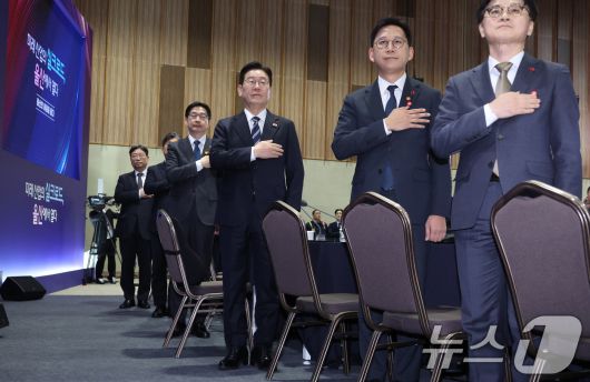 (울산=뉴스1) 허경 기자 = 이재명 대통령이 23일 울산전시컨벤션센터에서 열린 '울산의 마음을 듣다' 타운홀 미팅에서 국민의례를 하고 있다. 2026.1.23/뉴스1