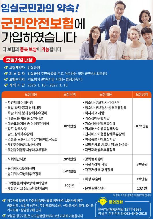 심민 군수는 "사고는 무엇보다 예방이 최우선이지만 예기치 못한 사고는 누구에게나 발생할 수 있다"며 "군민안전보험은 군민을 보호하는 최소한의 안전장치인 만큼 보장항목을 지속적으로 보완하고 확대해 실질적인 도움이 될 수 있도록 하겠다"고 말했다.