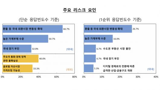대외 리스크 요인으로는 '주요국 통화·경제 정책 관련 불확실성'(40.0%)과 '글로벌 자산시장 가격조정 가능성'(33.3%)이 주요 위험으로 지목됐다.