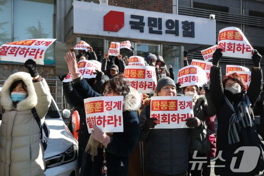 21일 오후 대구 수성구 국민의힘 대구시당 앞에서 한동훈 전 대표 지지자들이 한 전 대표의 당원 게시판 사건과 관련 당 징계 철회를 촉구하는 집회를 열고 있다. 2026.1.21/뉴스1 ⓒ News1 공정식 기자 |