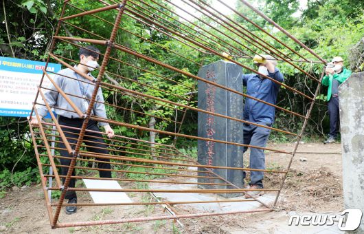 제주시 연동 박진경 대령 추도비에 박 대령의 4·3 사건 가담을 비판하는 시민단체가 설치한 '역사의 감옥에 가두다' 라는 이름의 감옥 조형물이 강제 철거되고 있다. 2022.5.20/뉴스1 ⓒ News1 오미란 기자 |