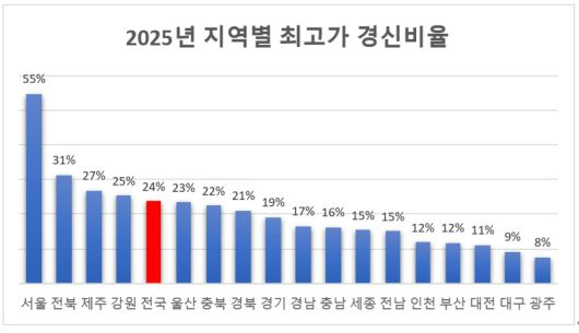 지역별 아파트 최고가 경신 비율 현황 [표=리얼하우스] |