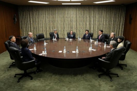 우에다 가즈오 일본은행 총재와 금융정책위원 9명이 23일 일본은행 본부에서 열린 금융정책결정회의에 참석 중인 모습./로이터=뉴스1 |