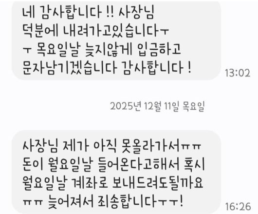 함께 공개된 문자 메시지 캡처에는 남성이 "돈이 계속 안 들어와서 야간 물류 상하차를 하고 있다", "절대 안 드리거나 그러지 않는다"며 변명을 이어가는 내용이 담겼다.