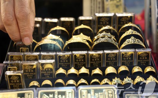 (서울=뉴스1) 최지환 기자 = 국제 금값이 사상 처음으로 온스당 4천900달러를 돌파한 23일 서울 종로구 한 금은방에서 직원이 골드바를 정리하고 있다. 2026.1.23/뉴스1