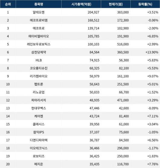 23일 한국거래소에 따르면, 시가총액 1위인 알테오젠(196170)은 현재가 38만 3000원으로 전 거래일 대비 3.51% 상승하며 강세를 보이고 있다. 시가총액은 20조 4927억원이며, 외국인비율은 13.04%다. 이 종목은 PER 163.12배, ROE 29.52%로 재무 지표에서 높은 수치를 기록하고 있으며, 거래량은 124만 4381주를 기록 중이다. 시가총액 2위인 에코프로비엠(247540)은 17만 2300원으로 전 거래일 대비 0.06% 하락하며 보합세를 보이고 있다. 이 종목의 시가총액은 16조 8512억원이며, 외국인비율은 12.72%다. PER은 5384.38배로 높고, ROE는 -6.26%로 부진한 모습을 보인다. 거래량은 61만 6697주로 나타난다.