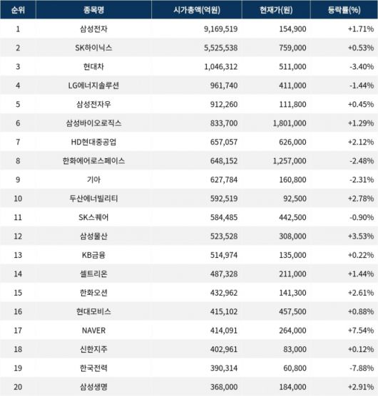 한편 시가총액 20위권 종목들은 SK스퀘어(402340) ▼0.90%, 삼성물산(028260) ▲3.53%, KB금융(105560) ▲0.22%, 셀트리온(068270) ▲1.44%, 한화오션(042660) ▲2.61%, 현대모비스(012330) ▲0.88%, NAVER(035420) ▲7.54%, 신한지주(055550) ▲0.12%, 한국전력(015760) ▼7.88%, 삼성생명(032830) ▲2.91% 등의 성적을 기록하고 있다.