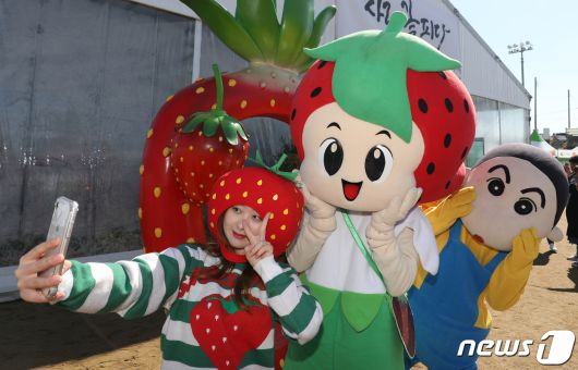 충남 논산시 대교동 논산천 둔치에서 열린 ‘2019 논산 딸기 축제’ 행사장을 찾은 시민들이 딸기 캐릭터 인형과 사진을 찍고 있다. 2019.3.24/뉴스1 ⓒ News1 |