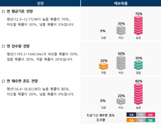 우리나라 주변 해역의 해수면 온도는 연중 고온을 유지할 것으로 보인다. 연평균 해수면 온도가 평년(16.4~16.6도)보다 높을 확률은 80%, 비슷할 확률은 20%, 낮을 확률은 0%다. 기상청은 지난해 전 지구 해양 열용량이 관측 이래 최고치를 기록해 북태평양, 대서양, 인도양 등 전 해양의 해수면 온도와 한반도 주변 해역 해수면 온도가 평년보다 높게 유지되고 있다고 밝혔다.