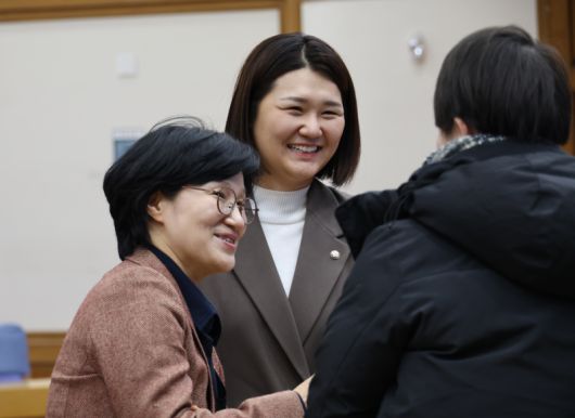 상영회를 마친 뒤 인사하는 모습. 왼쪽부터 성평등가족부 원민경 장관, 진보당 손솔 의원, 전국교직원노동조합 김지연 부위원장(뒷모습). 손솔 의원실 제공 |