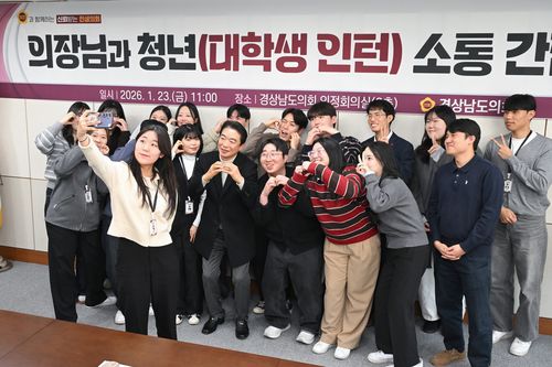 ▲ 최학범 경남도의회 의장은 23일 도의회에서 제3기 대학생 인턴십 참여 학생 등 경남 청년 20여명과 소통 간담회를 개최했다. 최 의장은 "오늘 청년들이 전한 의견은 책상머리에서 알 수 없는 소중한 정책 자산"이라며 "청년이 체감하는 정책으로 이어지도록 의회 차원에서 노력하겠다"고 밝혔다. (사천=연합뉴스)