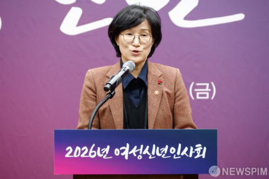 [서울=뉴스핌] 류기찬 기자 = 원민경 성평등가족부 장관이 23일 오후 서울 중구 은행회관에서 열린 2026년 여성신년인사회에서 축사를 하고 있다. 2026.01.23 ryuchan0925@newspim.com