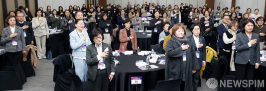 [서울=뉴스핌] 류기찬 기자 = 원민경 성평등가족부 장관과 참석자들이 23일 오후 서울 중구 은행회관에서 열린 2026년 여성신년인사회에서 국민의례를 하고 있다. 2026.01.23 ryuchan0925@newspim.com