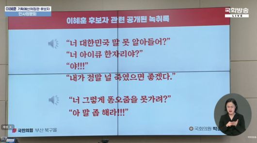 23일 이혜훈 기획예산처 장관 후보자에 대한 국회 인사청문회에서 이 후보자의 폭언이 담긴 녹취가 재생됐다.