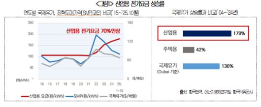산업용 전기요금은 2022년 러․우전쟁이 일어나며 유가, LNG 등 연료비가 급등한 이후 한국전력 적자가 늘어나자 7차례에 걸쳐 70%가량 인상됐다. 특히 2023년 11월과 2024년 10월 인상시에는 가정용은 동결하고 산업용 전기요금만 올렸다.