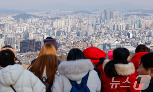 (서울=뉴스1) 안은나 기자 = 23일 서울 남산을 찾은 외국인 관광객들이 도심 전경을 감상하고 있다. 한국은행이 이날 발표한 '2026년 1월 소비자동향조사 결과'에 따르면 1년 뒤 집값 전망을 나타내는 주택가격전망CSI는 124로 4년 3개월 만에 가장 높은 수준을 나타냈다. 2026.1.23/뉴스1