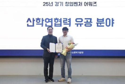 [서울=뉴시스] 신재철(오른쪽) 동국대 교수가 '2025 경기 창업벤처 어워즈'에서 중기부 표창을 수상하고 기념 촬영하고 있다. (사진=동국대 제공) 2026.01.23. photo@newsis.com *재판매 및 DB 금지 |