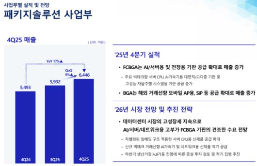 패키지설루션사업부 매출액은 6446억원이다. 전기대비 9% 전년동기대비 17% 상회했다. 글로벌 빅테크 서버 및 AI 가속기, 자율주행 시스템 등에 들어가는 FC-BGA와 모바일 애플리케이션프로세서(AP)용 BGA 등의 수요가 강했다. 올해도 데이터센터(DC) 강세는 이어진다. 신규 고객사 확보 등에 힘을 쏟는다. FC-BGA는 공급 부족 상황이다.
