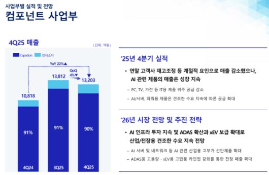 연말 재고조정 영향이 있었지만 AI·서버 및 파워용 MLCC 공급을 확대했다. 올해는 AI 인프라 투자와 첨단운전자보조시스템(ADAS) 확산을 기대했다.
