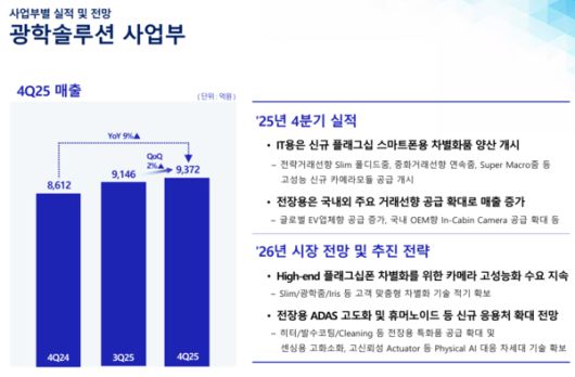 광학설루션사업부 매출액은 9372억원이다. 전기대비 2% 전년동기대비 9% 초과했다.