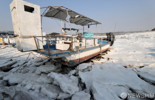 [인천=뉴스핌] 정일구 기자 = 연일 한파가 이어지고 있는 23일 오후 인천 중구 예단포항에 정박한 어선들이 꽁꽁 얼어붙은 포구에 갇혀 있다. 2026.01.23 mironj19@newspim.com