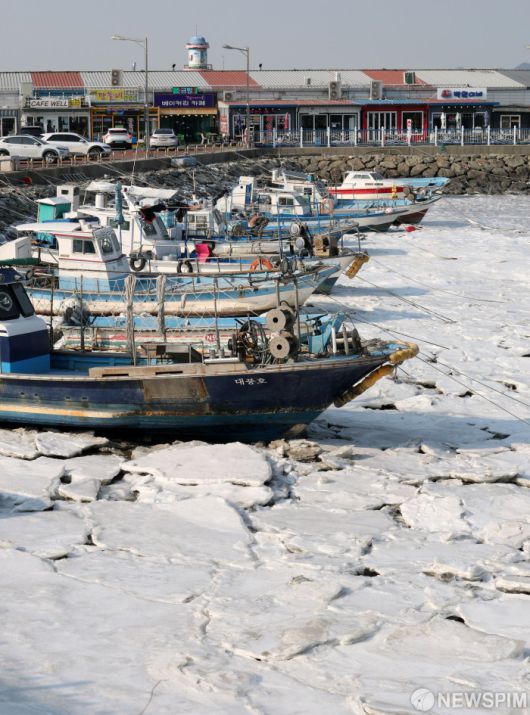 [인천=뉴스핌] 정일구 기자 = 연일 한파가 이어지고 있는 23일 오후 인천 중구 예단포항에 정박한 어선들이 꽁꽁 얼어붙은 포구에 갇혀 있다. 2026.01.23 mironj19@newspim.com