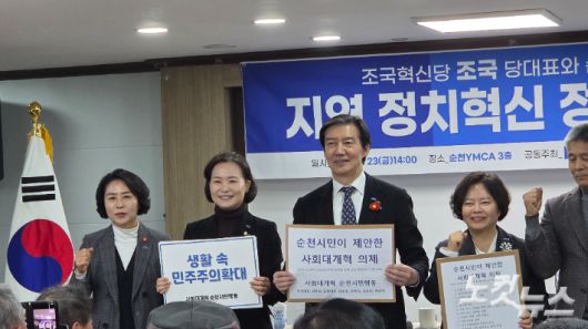 조국 혁신당 조국 대표가 23일 순천에서 시민단체 간담회를 열고 지역 현안 의제를 전달받은 뒤 기념촬영을 하고 있다. 박사라 기자 |