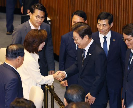 이재명 대통령이 지난해 6월 26일 추가경정예산 시정연설을 마친 뒤 국회 본회의장에서 나경원 국민의힘 의원과 인사하고 있다 (사진=연합뉴스) |