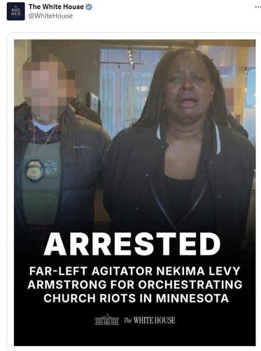 사진 속 여성은 지난 18일 미네소타주 세인트폴에서 교회 예배를 방해하는 데 가담한 혐의로 체포된 3명 중 한명인 네키마 레비 암스트롱이다.
